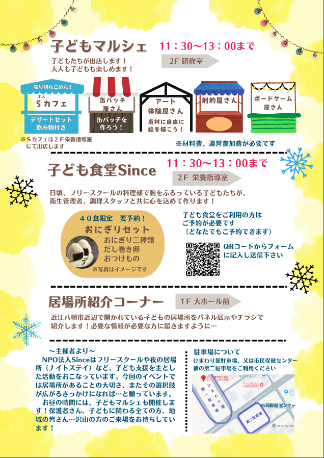 午前・午後には「ゆめパのじかん」自主上映会、お昼の時間帯にはこども食堂Since、Sinceに通うこどもたちによるこどもマルシェを開催させていただきます!