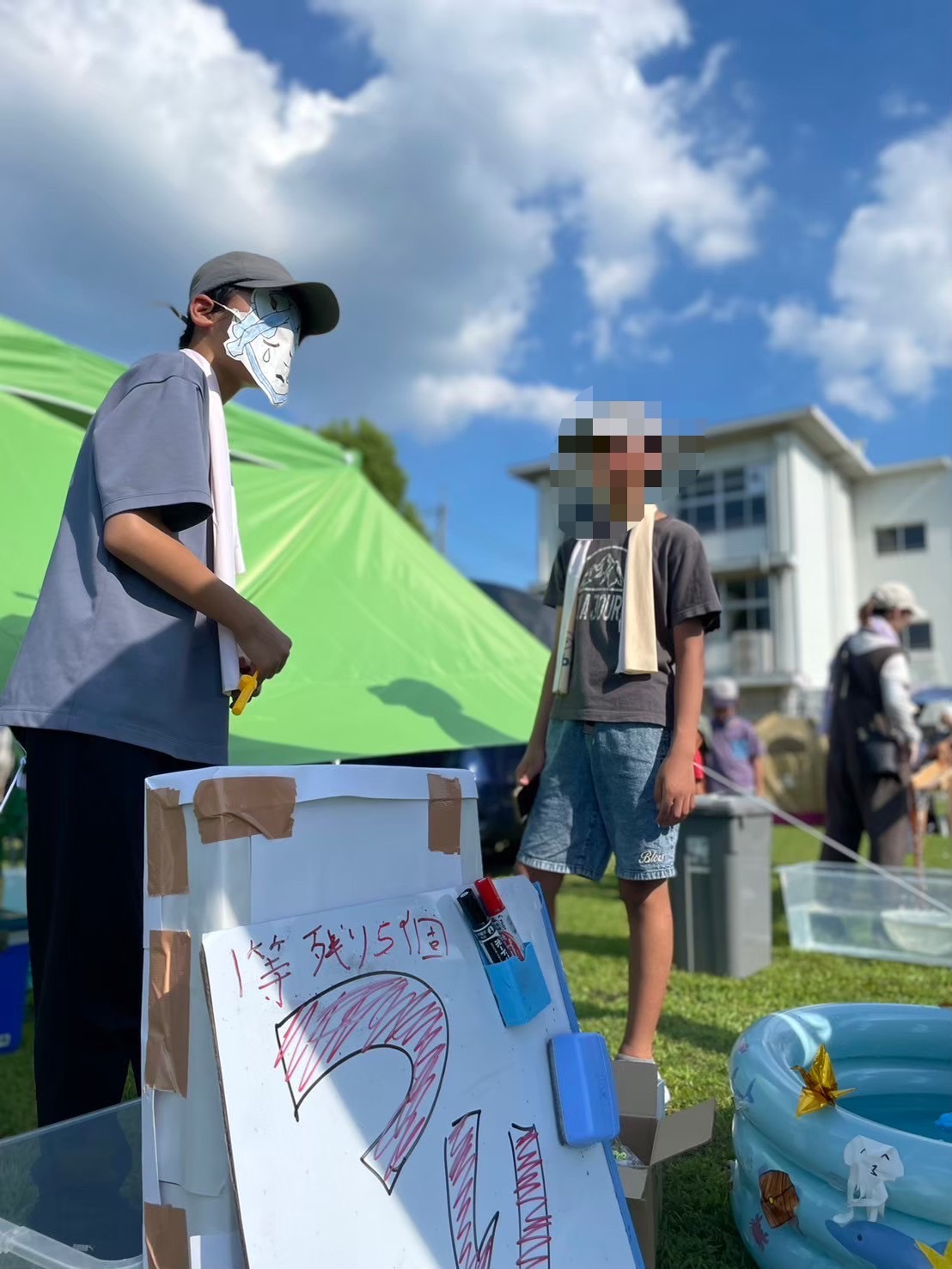 おもちゃ釣りでは、プールの中に、磁石をつけたおもちゃを浮かべ、それを釣り糸で取るというものを考え、こちらも試行錯誤を迎えながら当日を迎えました。最初、準備しているものをフリースクール拠点に忘れてしまい、焦る場面もありましたが、その後は店に列ができ良い感じでした。