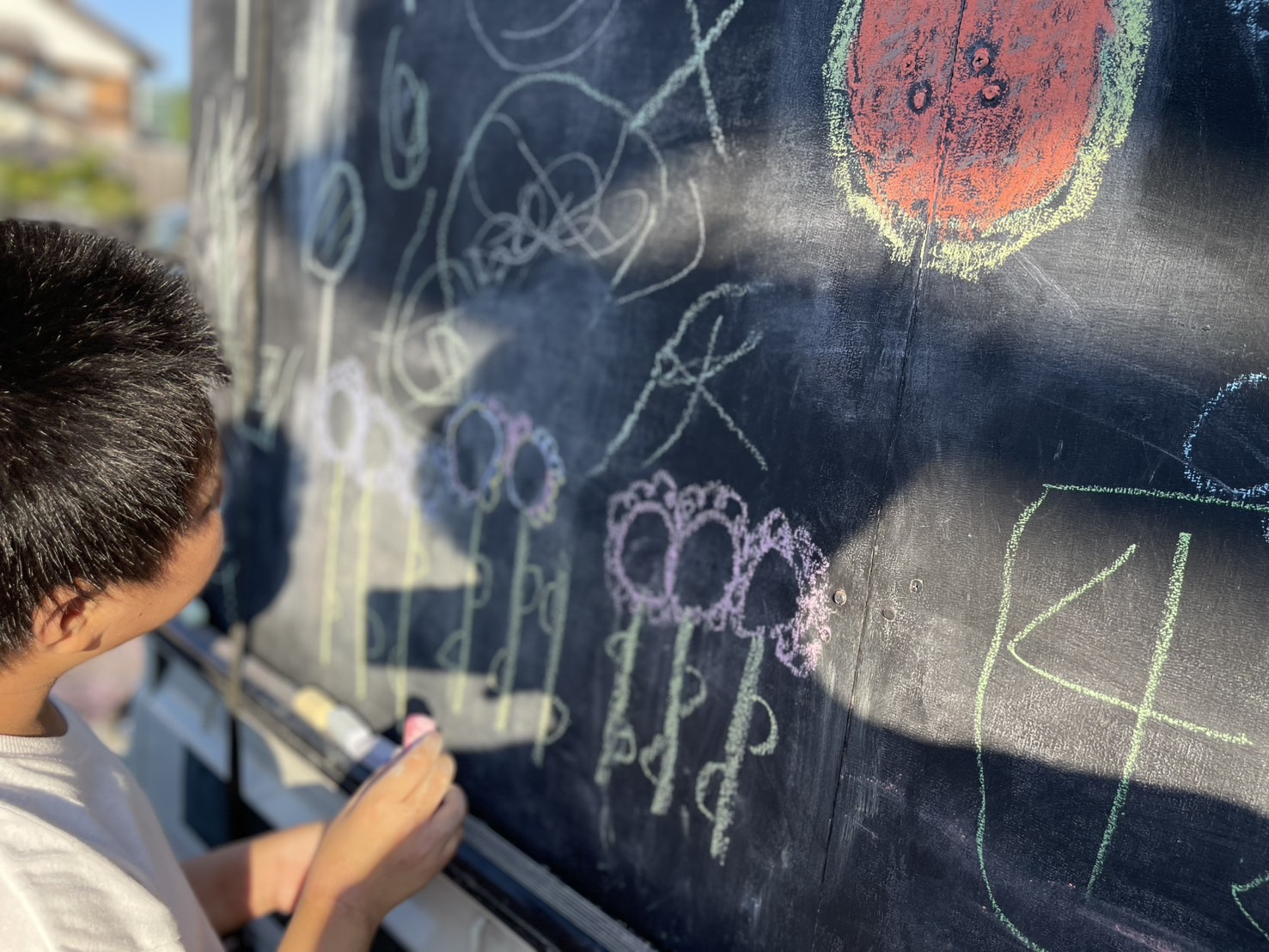 紙に絵を描くとなるとなかなか進まない子もいる中で、チョークで自由に描ける環境があると発想豊かに思うままに描くことができることもあるんだなと学びになりました。