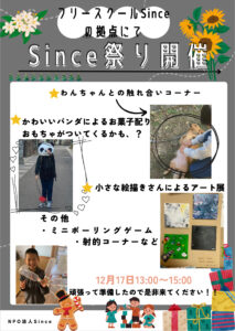 また、フリースクールのプログラムのトライでは、12月17日(日)に行うSince祭り(文化祭のようなもの)に向けて取り組んでいます。それぞれ、やりたい屋台・出し物などを考えて小グループで色々と進めています。
