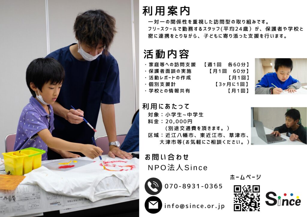 一対一の関係性を重視した訪問型の取り組みです。フリースクールで勤務するスタッフが、保護者や学校と密に連携をとり、子どもに寄り添いながら支援します。