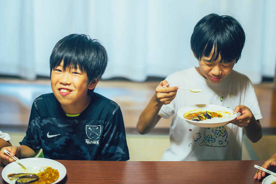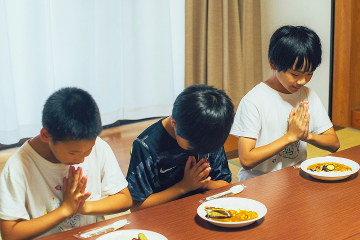 みんなでいただきまーす!!待ちに待った夜ご飯!ワイワイ賑やかに食べる子も、ゆっくり味わって食べる子も。自分が使ったお皿は、自分で片付けます。
